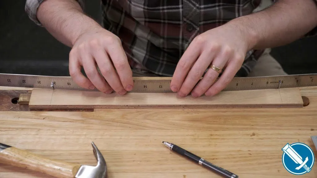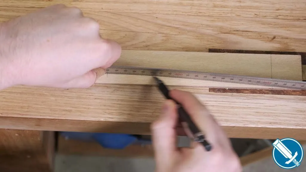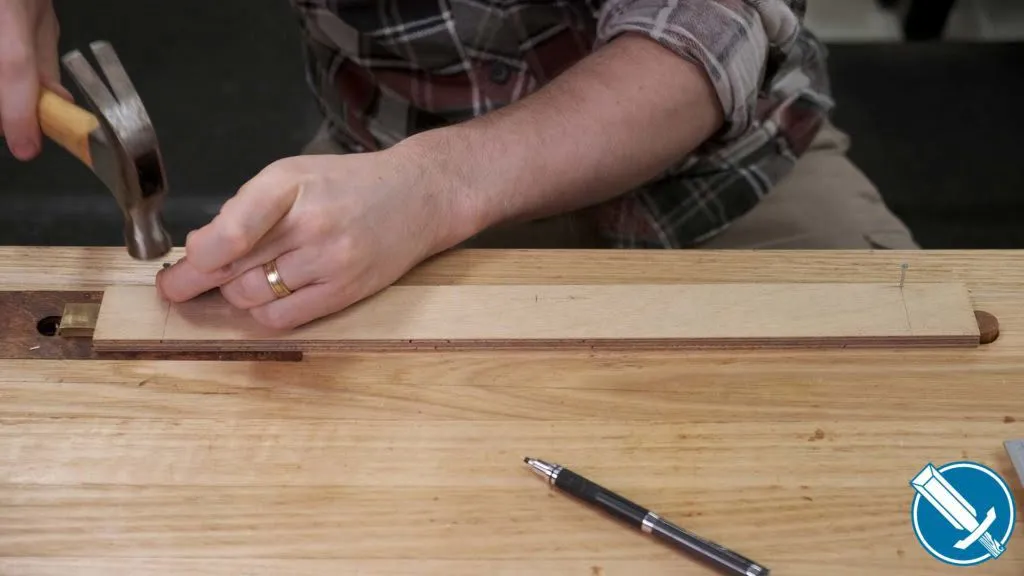 Using a scrap of 9 mm plywood, cut to 40mm wide to match the width of the rail but about 50mm longer at either end of the length of the aprons, I measure up the height I want for my arc. Then I drive a couple of nails partially into where the ends of the aprons will come to.