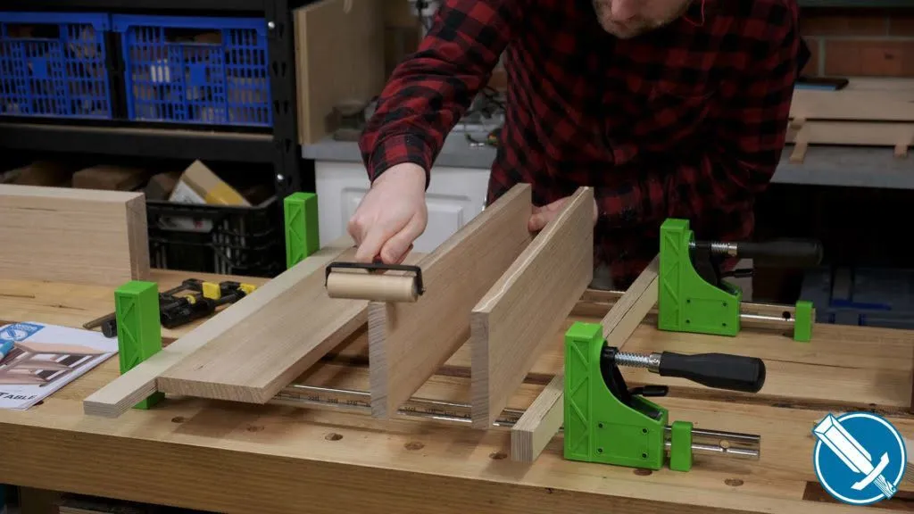 I find it much easier to apply finish before glue up, rather than after. Particularly with this hardwax oil, it’s easy to do touch ups after glue up if need be. I apply just two coats, rolling it on with a microfibre roller.